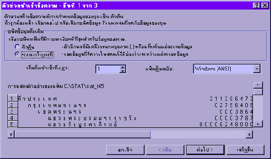 - เลือก Option ที่เป็นความกว้างคงที่ กดปุ่มต่อไป และแบ่งโครงสร้าง ตามโครงสร้างที่ปรากฏบน Page ที่ทำการ Download ข้อมูล